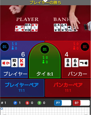 左がプレイヤーで右がバンカーと呼ばれており、より9に近い方が勝ちとなります。上記の画像の場合はバンカーの勝ちなので、バンカーが勝つ方にBETしていた場合、BET額がほぼ倍になって払い出されます。